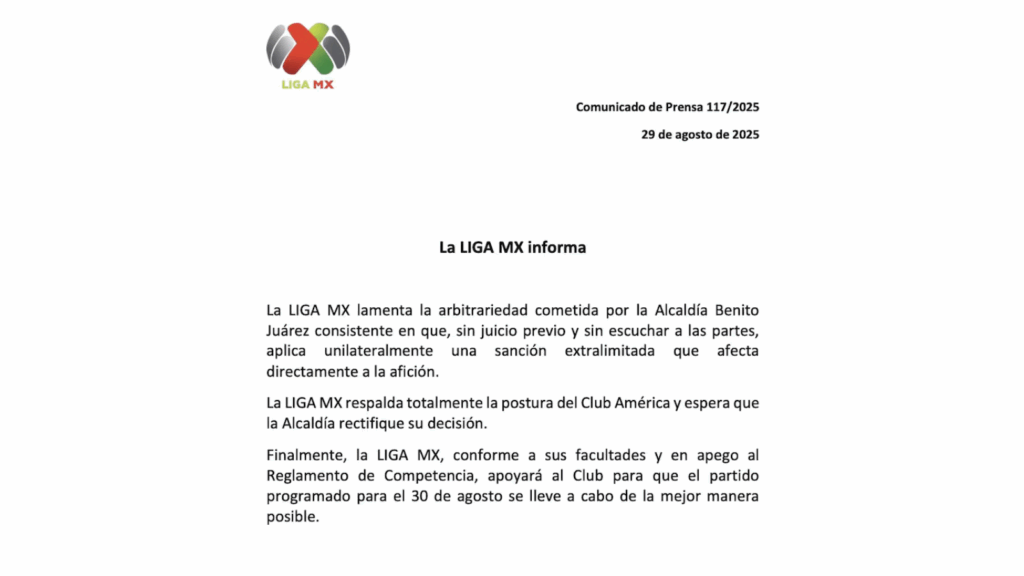 La Liga MX emitió este 29 de agosto el comunicado oficial en su cuenta de X en el que califica como “arbitraria y unilateral” la decisión de la alcaldía Benito Juárez de cerrar el Estadio Ciudad de los Deportes para el partido América vs. Pachuca, correspondiente a la jornada 7 del torneo Apertura 2025.