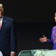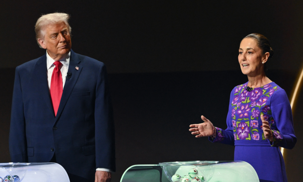 Trump, Sheinbaum y el primer ministro canadiense, Mark Carney, líderes de los tres países anfitriones del torneo, subieron al escenario y se situaron en diferentes podios...